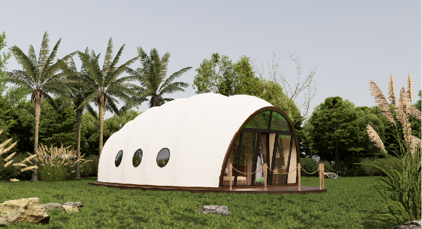 框架:优质碳钢圆管,焊接工艺 外膜:优质PVDF膜材+编织铝箔 内膜:底部1.2米户外弹力布+上方380g普通弹力布 门窗:112断桥铝合金+中空玻璃+圆形侧窗 规格:5.6*9m 套内面积:43.8㎡ 抗风等级:10级以下